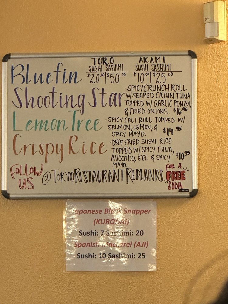 Tokyo Restaurant, a Japanese sushi bar located in Redlands, CA, offers a diverse menu with many vegetarian options. Customers praise the top-notch service, fresh sushi, and cozy ambiance. The bento box beef and baked sushi are standout dishes, with customers raving about the attentive staff and delicious food. The restaurant provides a casual dining experience with options for private dining and catering. With accessible parking, wheelchair accessibility, and various amenities such as Wi-Fi and outdoor seating, Tokyo Restaurant caters to a wide range of customers. Whether you're looking for a quick bite or a leisurely meal, Tokyo Restaurant stands out for its quality sushi and friendly atmosphere. Next time you're craving authentic Japanese cuisine, Tokyo Restaurant is a must-visit spot.
